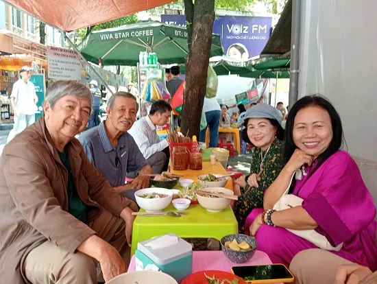 Hai ông xe ôm gửi xe, đi vào đường sách thì thấy hai nàng ngồi chờ tự bao giờ. Bây giờ là giờ Ngọ, bao tử chưa réo gọi nhưng phải ăn cho đúng giờ để còn sức đi dạo các cửa hàng sách. Trên đường sách có hai –ba quán cà phê có bán bánh ngọt, chỗ ăn thì Kiều Huệ chọn quán bún bò ở đầu đường phía Hai Bà Trưng. Ngon hay không – chưa biết, nhưng khách ngồi đông đến mức phải chờ khách đi mới có chỗ ngồi.