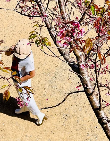 Tôi bước khẽ dưới tán mai anh đào đang nở rộ giữa buổi trưa nắng vàng, lòng lặng lẽ ngập tràn hoài niệm mơ hồ. Làn áo phất phơ trong gió êm, đôi giày trắng lặng lẽ theo chân bước, chiếc khăn sặc sỡ quàng ngang vai như một điểm tươi sáng giữa không gian mênh mang. Tay khẽ giữ vành mũ, tôi cố nắm lấy từng hơi ấm dịu dàng của nắng xuân thoảng hương hoa, như mong níu kéo một mảnh quá khứ xa xăm. Những kí ức thoáng hiện làm trái tim tôi xao xuyến, nỗi ưu tư len lỏi trong lòng, khiến cả cảnh vật đượm buồn dịu dàng và cô đơn đến lạ.