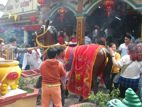 Trước cửa Miễu Bà Mạch Nước , ấp Thới Tứ, xã Thới Tam Thôn, Hóc Môn có một con ngựa đen mun (quên sờ xem bằng gỗ hay xi măng) gần bằng ngựa thật. Lưng ngựa không có yên nhưng có phủ tấm vải đỏ giống như tấm vản hay tấm hoành có tua. Những người đi cúng Bà, từ nam phụ lão ấu đều đến gần, người thì vuốt đuôi ngựa, kẻ lấy tay rờ bờm xong rồi vuốt mặt mình, vuốt tóc mình có vẻ muốn lấy cái may mắn hay quyền phép từ con ngựa sang bên mình. Có cô gái còn chui xuống bụng ngựa, rờ chi chẳng biết rồi chui lên. Hình thức rờ rẩm linh vật này không phải là hiếm. Ở Dinh Cô (Bình Thuận) trước đền cũng có mấy con cọp, mấy bà cũng lại trước tượng cọp thoa thoa đầu cọp rồi vuốt vào quần áo mình, người ngoài xem cứ tưởng phép tắc từ con vật đó truyền sang vậy. Ai đi miễu này rồi chắc cũng đã thấy qua, vậy những người lớn tuổi đi nhiều lần cho biết xem có lịnh nghiệm trong trường hợp này không ? Năm nay, Bính Ngọ tục vuốt đuôi ngựa càng được chú ý