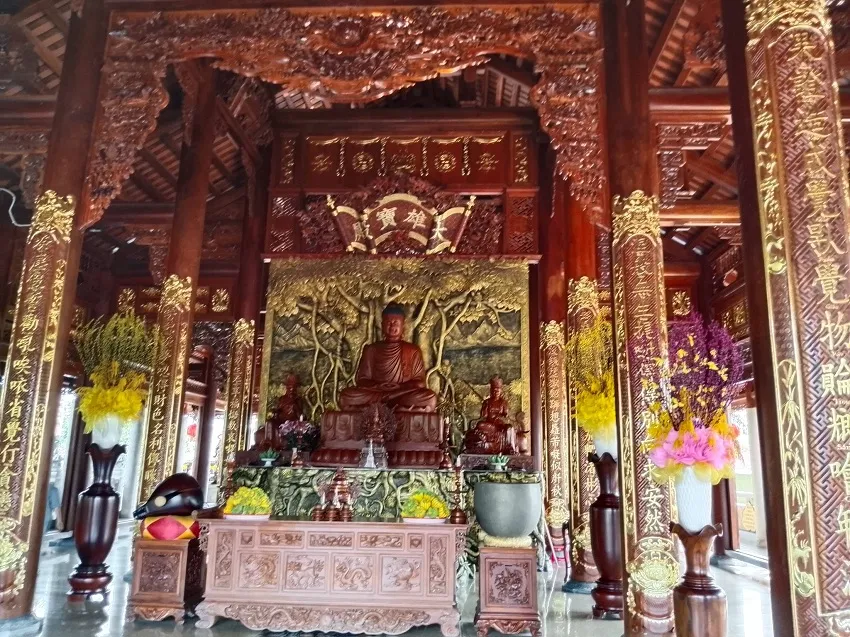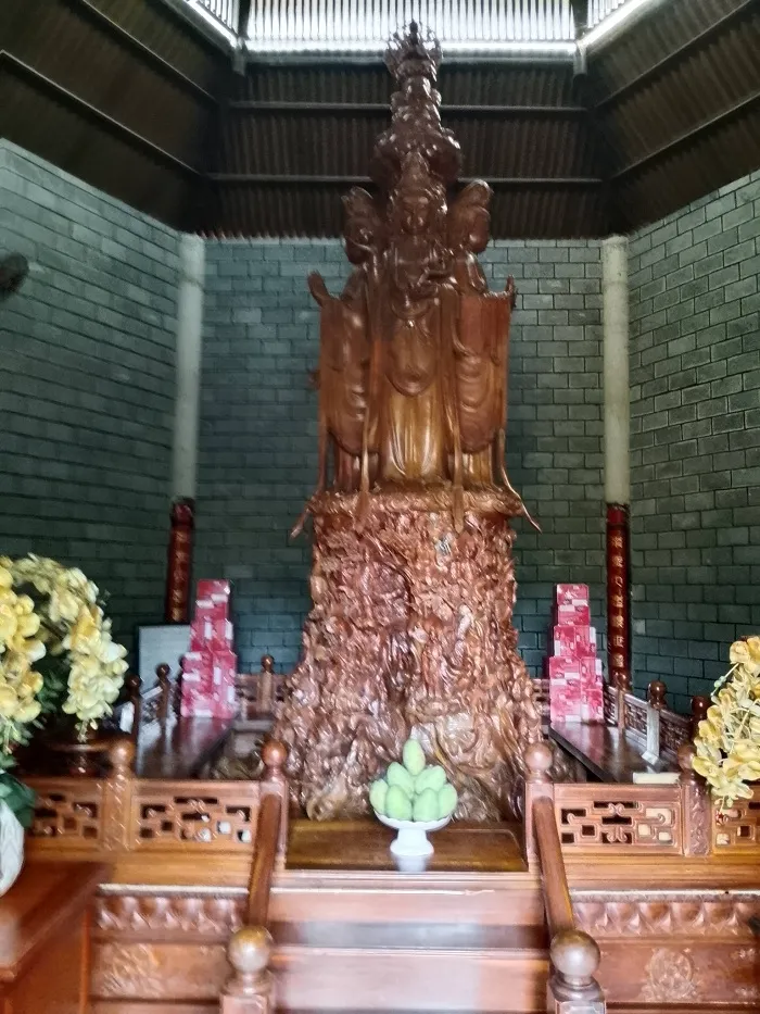 Chùa có trụ Phật bằng gỗ mít đặt trong tòa bát giác. Một Phật tử hướng dẫn và mở cửa cho chúng tôi vào tham quan. Nhìn khối gỗ , tôi không biết trên dưới có bao nhiêu vị Phật, đây phải nói là sự chạm trỗ tinh vi .
