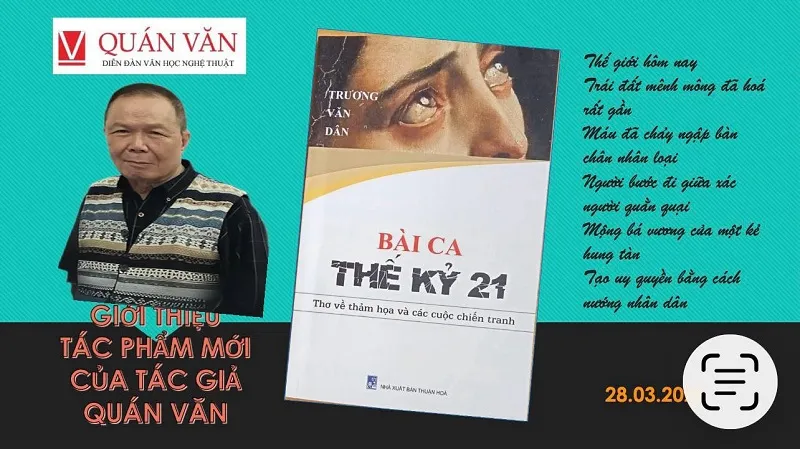 Nhà văn Trương Văn Dân lần đầu ra mắt tập thơ Bài ca thế kỷ 21 và có nhã ý tặng 20 cuốn cho Quán Văn phát hành, Chương trình đã kết hợp giới thiệu vài nét chính. Mở đầu là phần đề dẫn tóm tắt của Hoàng Kim Oanh. Tiếp theo, nhà thơ Hồng Lĩnh – Phạm Thị Quý đã đọc diễn cảm nguyên văn bài thơ “Một người và triệu người” (tr.46-48). Nhà văn Dạ Ngân cho rằng tập thơ “Bài ca thế kỷ 21” của anh Truơng Văn Dân là một tập thơ để đọc bằng mắt và bằng tim không phải để ngâm. Đây chính là những bức xúc của một nhà văn, thể hiện một thái độ, một tư thế của người cầm bút trước những vấn đề lớn lao của thế sự không thể đứng ngoài. Nhà nghiên cứu Trần Hoài Anh vừa nhận tập thơ cũng bước đầu chia sẻ một số suy nghĩ về những đặc điểm của tập thơ 12 bài về chủ đề chiến tranh, đề tài không bao giờ cũ. Ông cho rằng “thơ như là một định mệnh, cho dù anh không thích”, Trương Văn Dân từng không thích thơ, nhưng đó là định mệnh của anh, “ghét của nào trời trao của ấy”. Với tâm thức của một người có trách nhiệm với những vấn đề lớn của đất nước, của nhân loại trước những mất mát ấy, Trương Văn Dân đã nói được tiếng lòng ấy, bằng thơ.