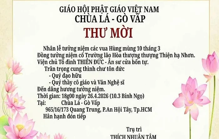 Các anh chi đang cư trú tại Gò Vấp, quận 12, Hóc Môn lưu ý. Ngày giỗ tổ Hùng Vương mùng 20 tháng 3 âm lịch chùa lá có tổ chức kỷ niệm. Kính mời anh chị em đến dự đông vui. Ở xa đến Xem tiếp